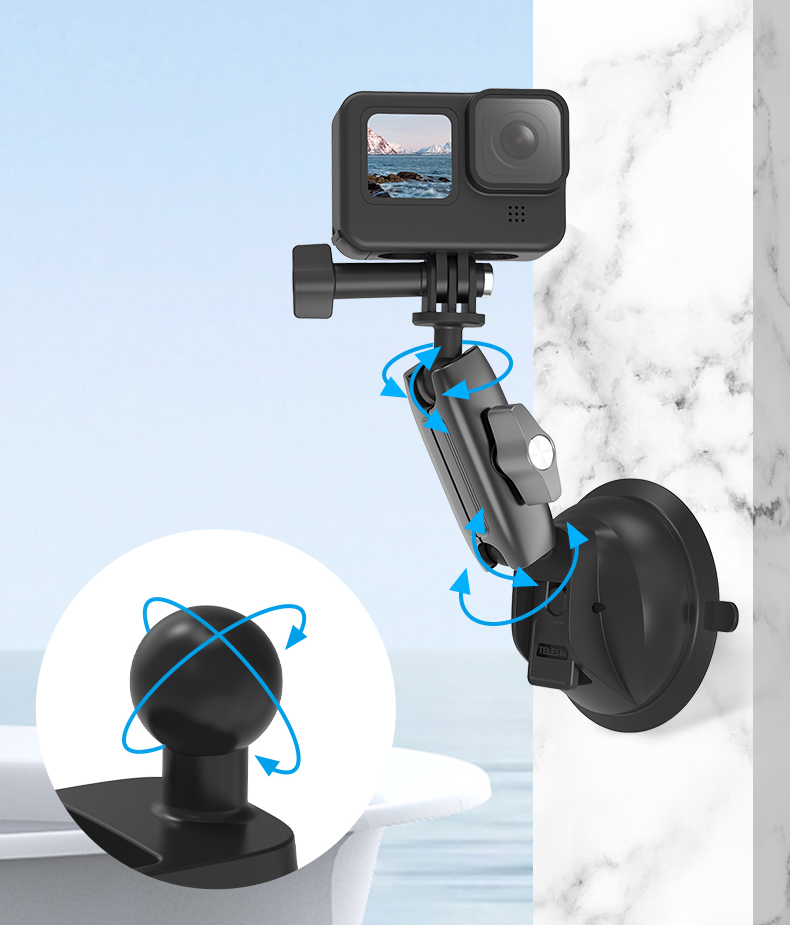 Благодаря своему уникальному дизайну присоск Telesin TE-SUC-010 может принять практически любой угол наклона так-как у нее две регулируемые головы на 360 градусов которые позволять установить камеру, смартфон под нужным углом обзора и снимать с необходимого ракурса. Присоска Telesin отличный помощник при съемки в автомобильном салоне, в небольшом помещении когда съемка например ведется с нескольких ракурсов то вы можете установить такую присоску на ЛЮБУЮ гладкую поверхность (окно комнаты, телевизор, зеркало или кухонный гарнитур) главное понимать, что вы хотите снять и как, а все необходимые аксессуары для съемки мы всегда подберем.