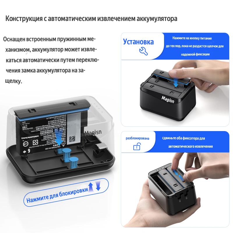 Зарядное устройство оснащено встроенным пружинным механизмом. Аккумулятор можно извлечь автоматически, переключив замок аккумулятора на защелку.