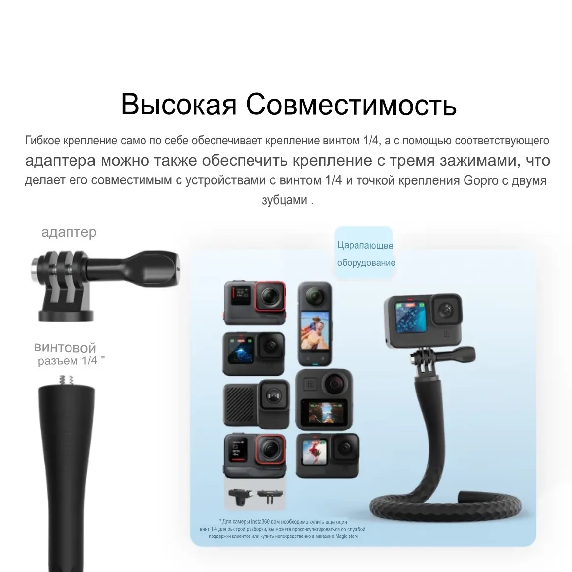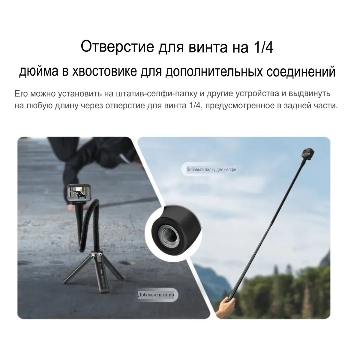 Винтовая штативная резьба 1/4 дюйма, позволяет установить необходимый адаптер или любую камеру с разъемом 1/4.
