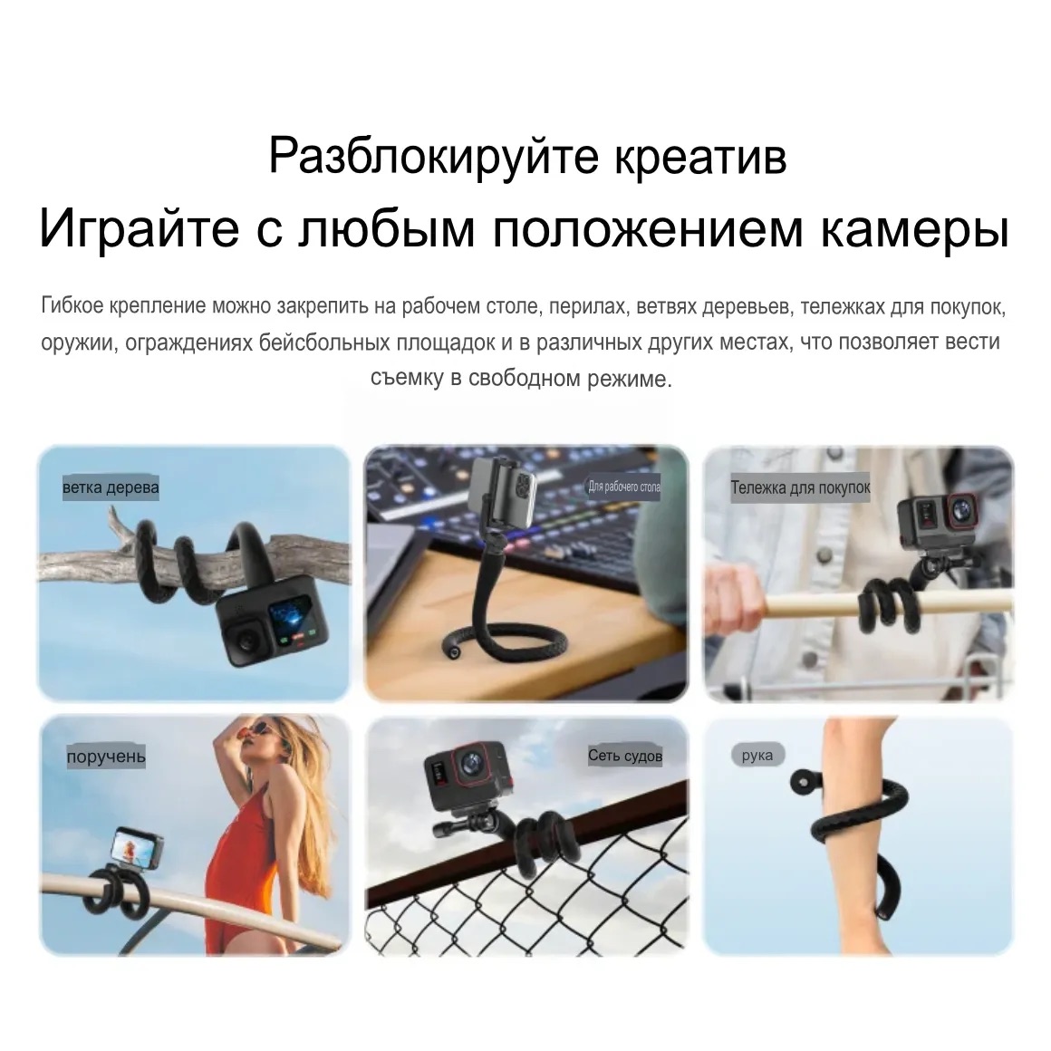 Главная особенность можно складывать любой формы и закрепить на различных объектах, например на рабочем столе, перилах, ветках деревьев, тележках для покупок, подлокотниках, ограждениях площадки и в других местах.