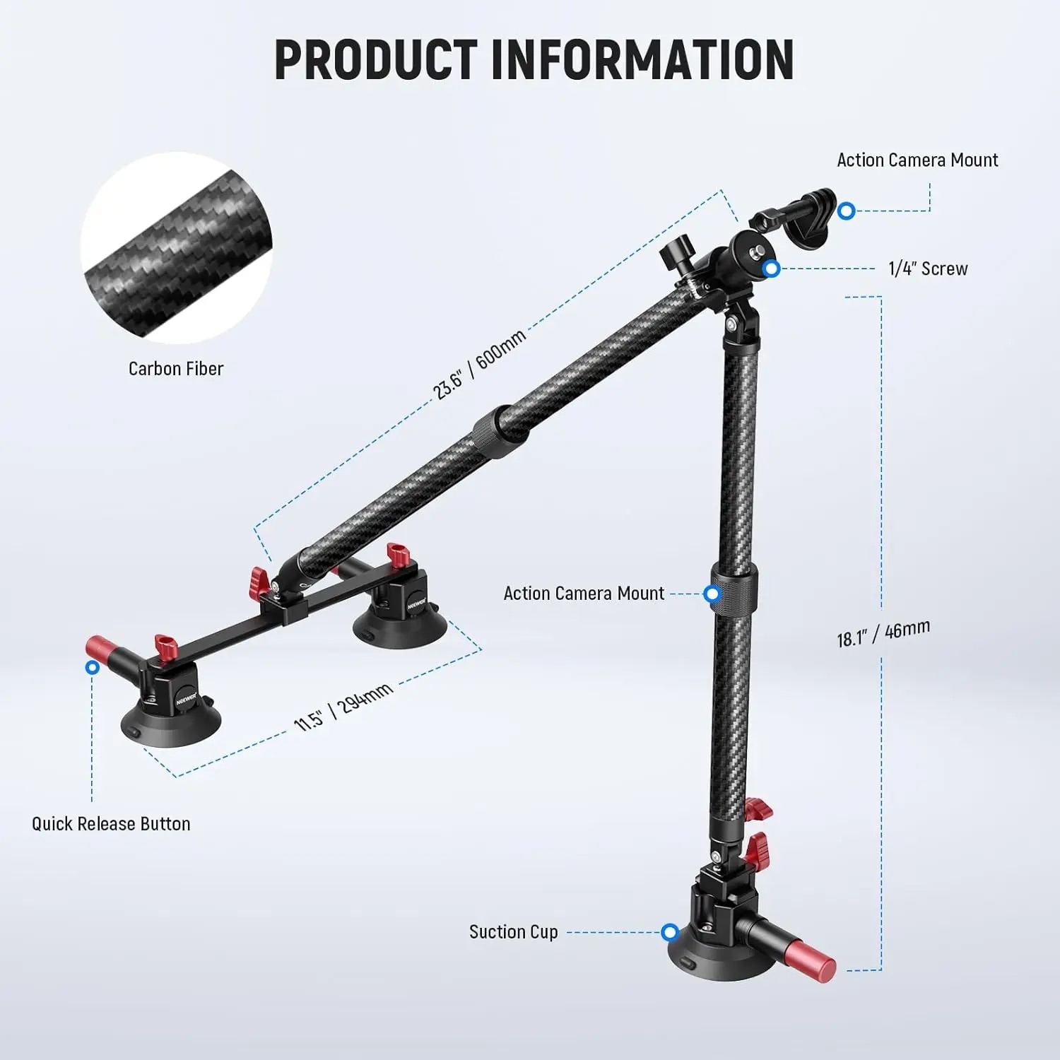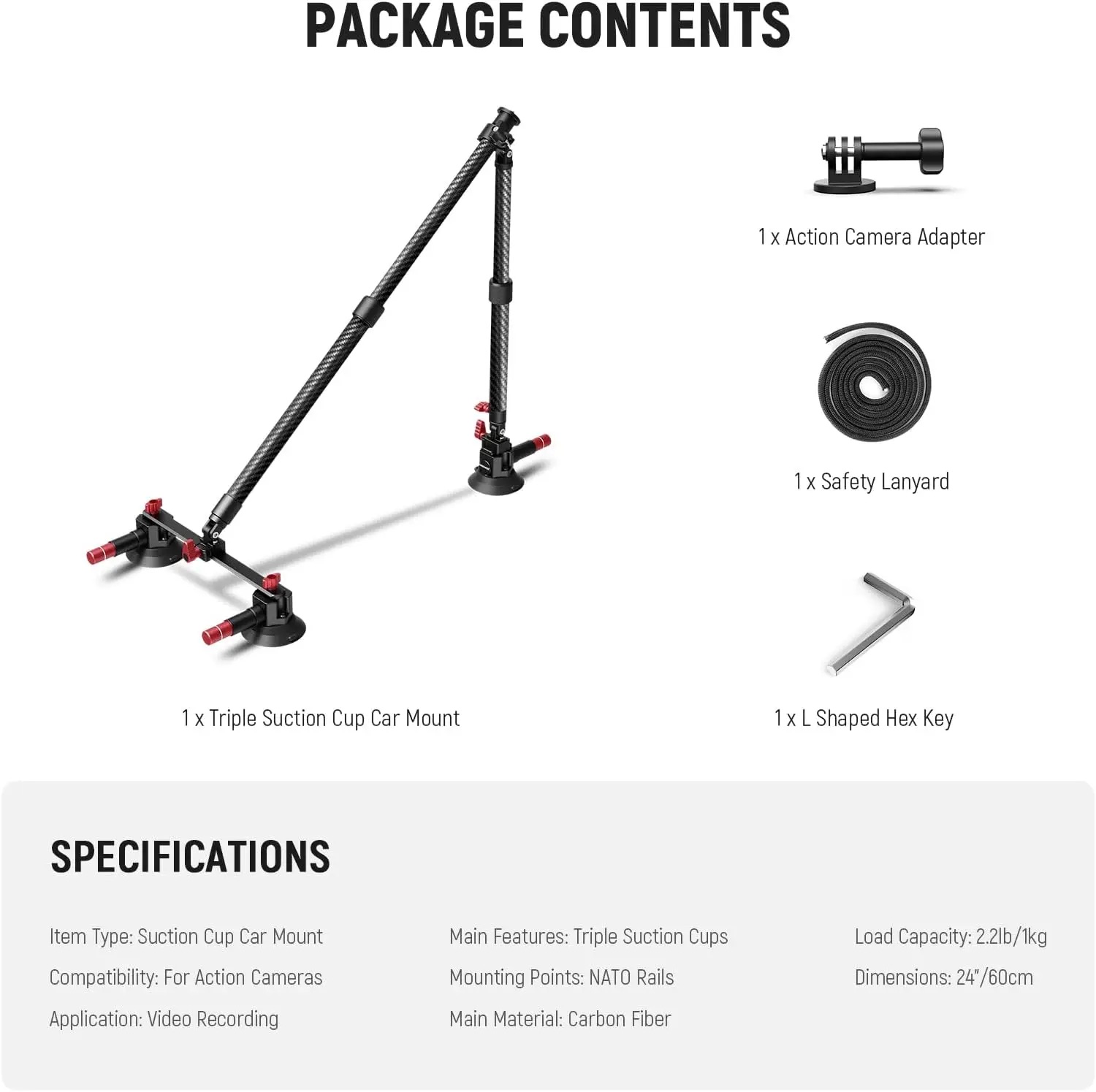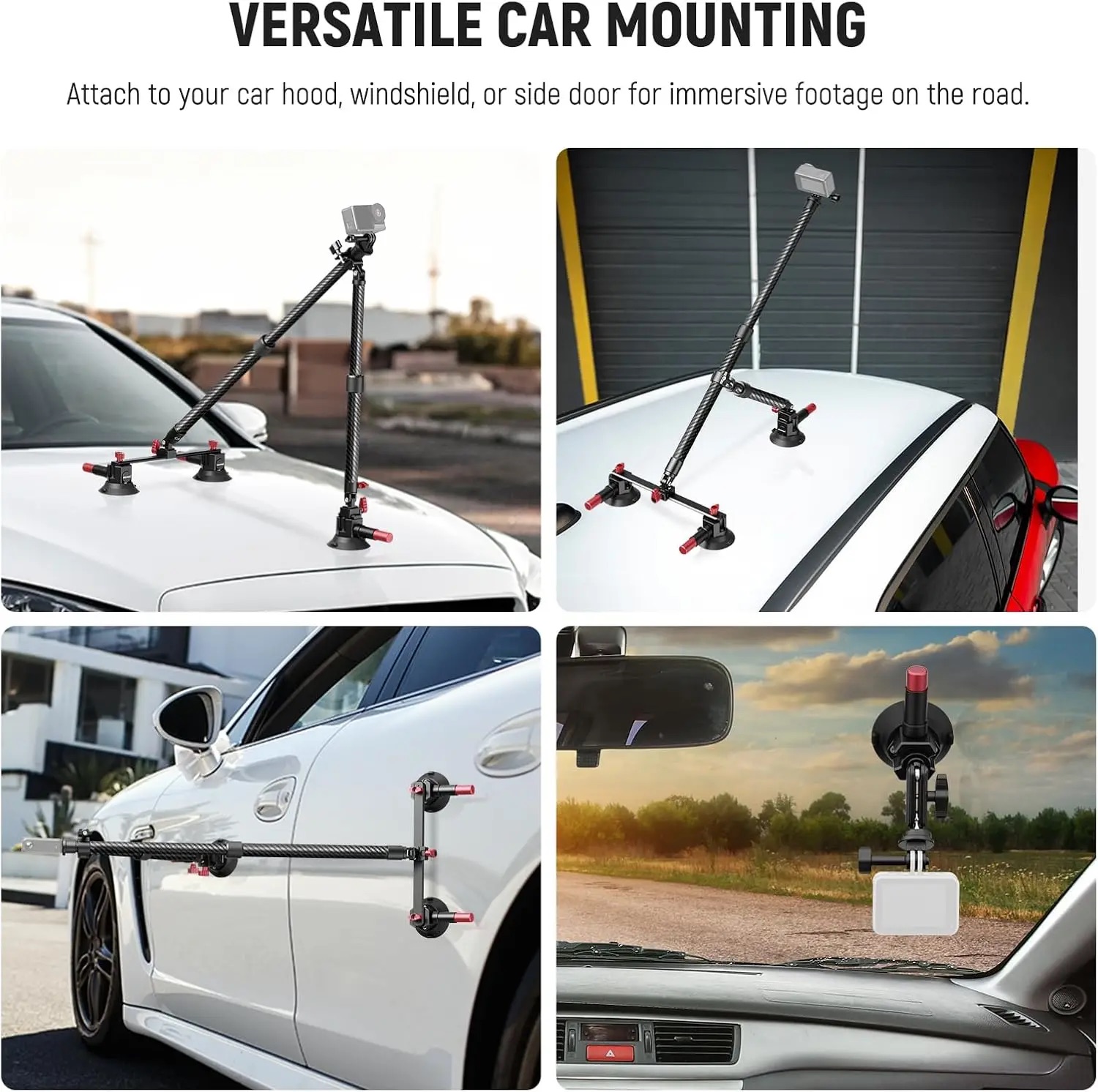 Этот комплект для автомобильного крепления с тройной присоской обеспечивает стабильную поддержку при съемке захватывающих дорожных кадров благодаря треугольной конструкции и надежным вакуумным присоскам. Две телескопические удлинительные стойки из углеродного волокна имеют длину до 60 см и поддерживают вес до 1 кг. Быстроразъемные направляющие и зажимы NATO обеспечивают простоту настройки, плюс универсальный адаптер для экшн-камеры