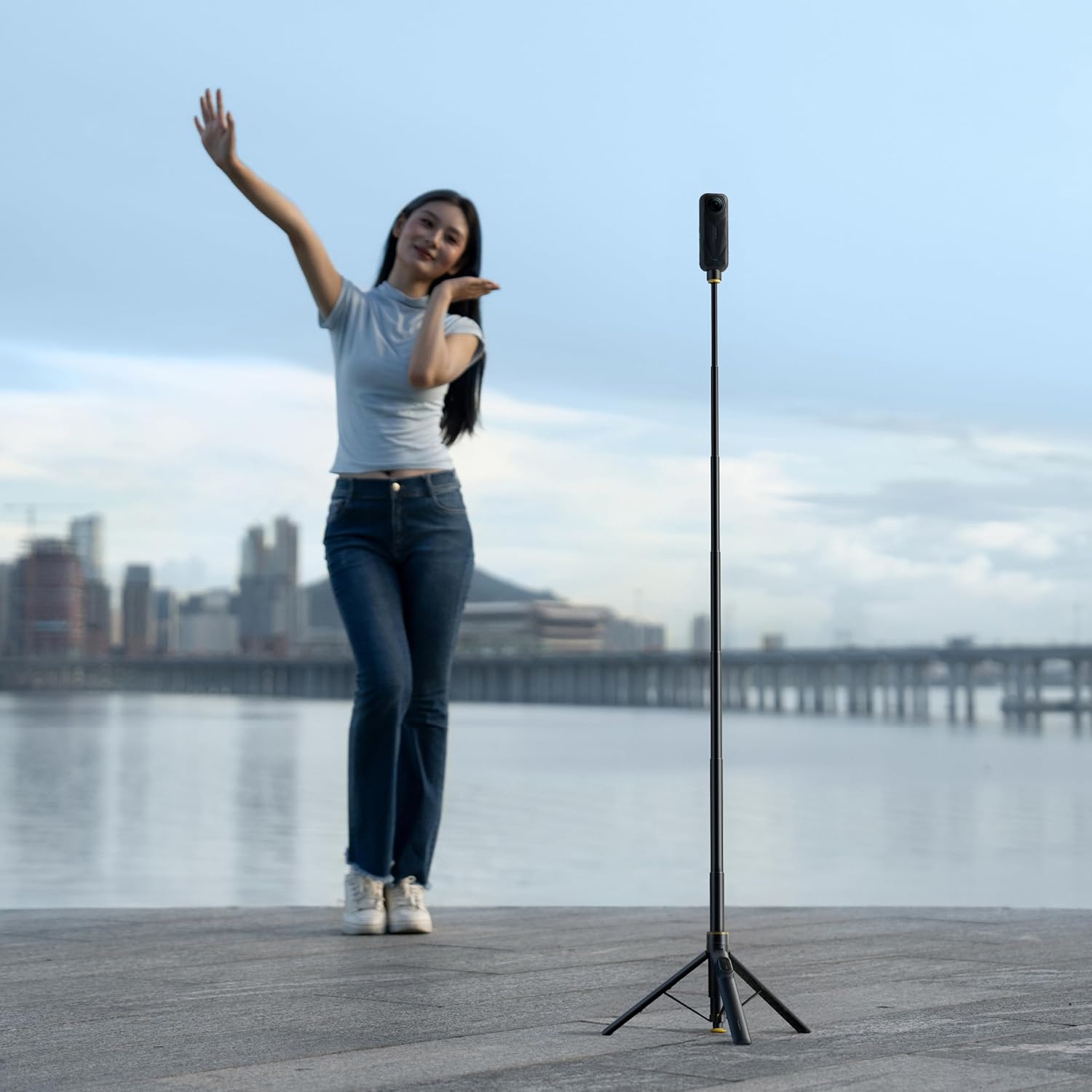Селфи-палка выдвигается на 1,1 метра, позволяя создавать креативные снимки. Прочный штатив надежно стоит даже на открытом воздухе.