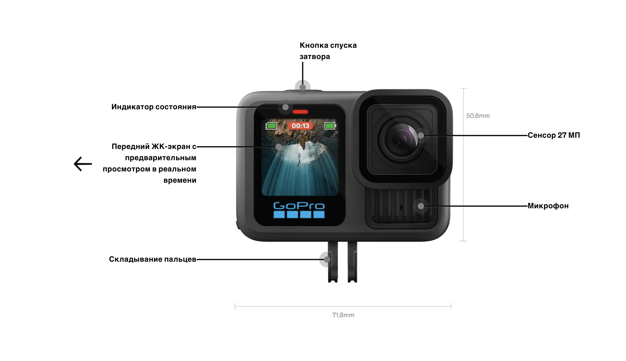 GoPro HERO13 Black оснащена тем же датчиком с соотношением сторон 8:7 и 1/1,9", что и HERO12 Black. Датчик можно обрезать до вертикального 9:16, широкоэкранного 16:9, традиционного 4:3 или полнокадрового 8:7. Это доступно для всех разрешений видео, а также для режимов TimeWarp, Time Lapse, Night Lapse и всех ночных эффектов.