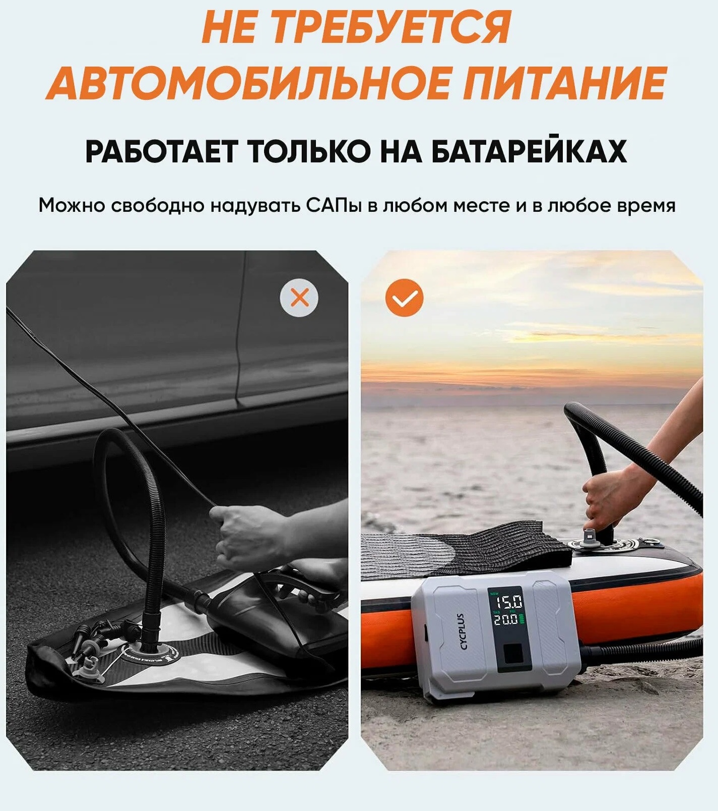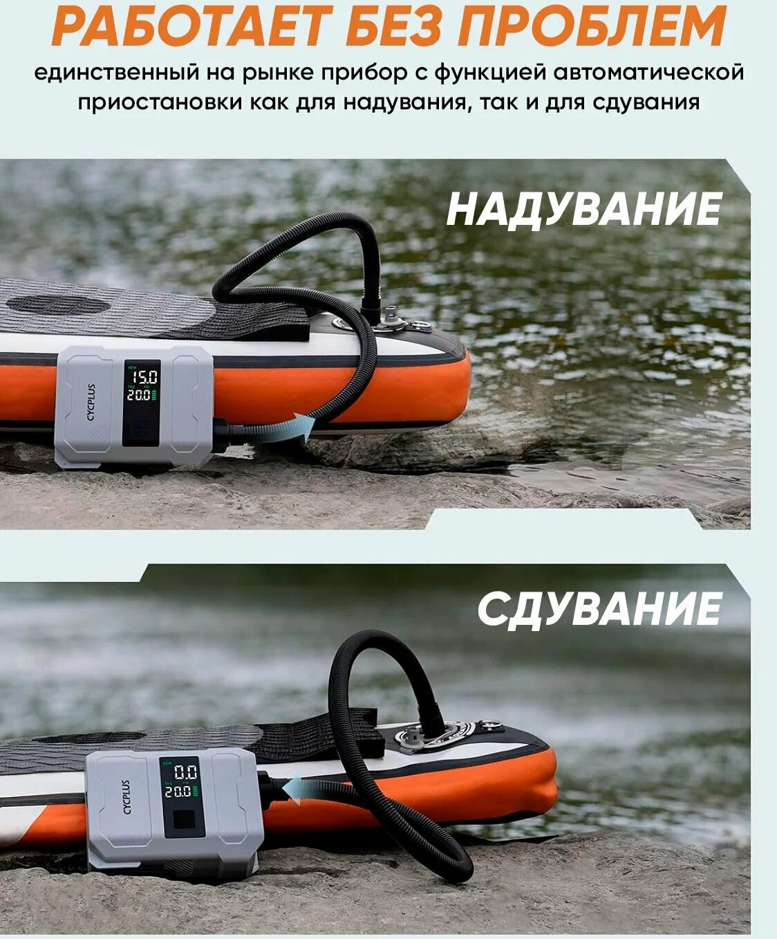 Насос Cycplus D17 Pro — это быстрое и удобное решение для накачивания надувных изделий, таких как SUP-доски, лодки, каяки и другие. Он оснащён мощным аккумулятором и может работать в любых условиях.