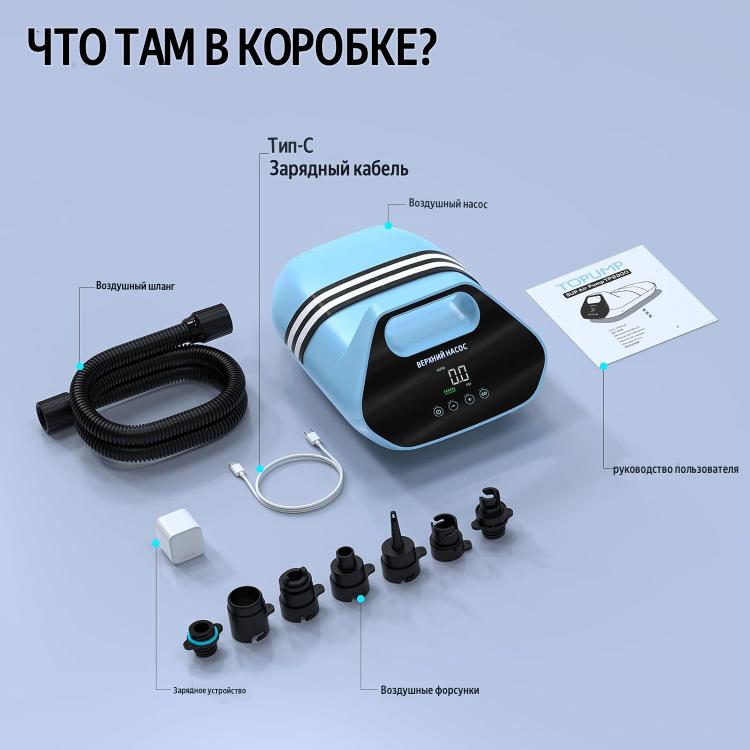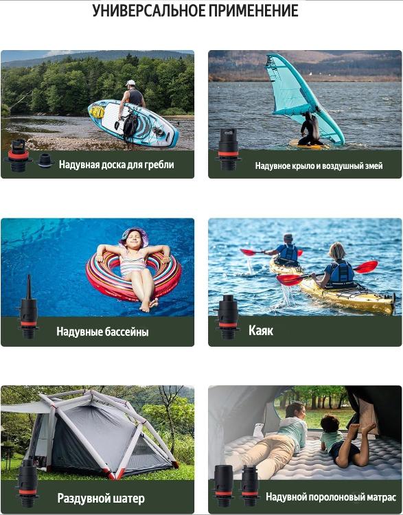 * В комплект входят 7 насадок, подходящих для большинства надувных изделий высокого давления, таких как доски для сапсерфинга, надувные матрасы, каяки, лодки, палатки и плавательные круги.