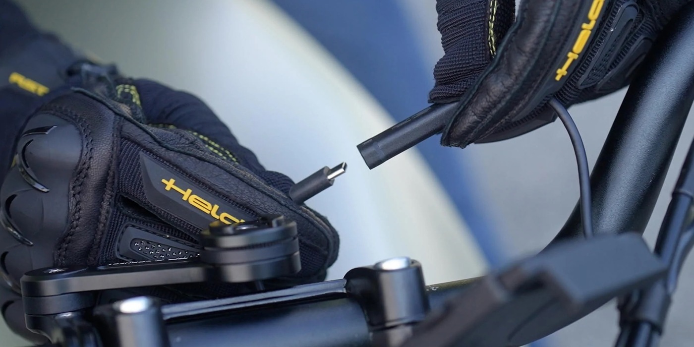 Всепогодный кабель SP Connect для подключения к аккумулятору мотоцикла. Он питает индуктивное зарядное устройство.